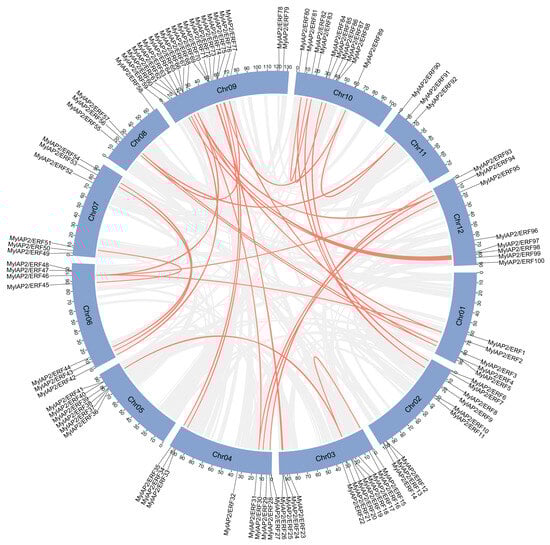 Gene duplication events between MylAP2/ERF genes from M. laxiflora. Gray lines indcate whole-genome synteny blocks, while red lines indicate replicated MylAP2/ERFs gene pairs.