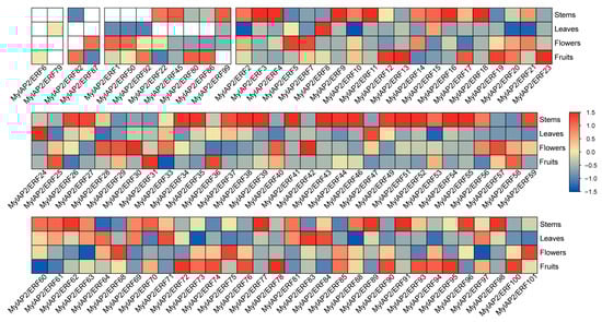 Expression patterns of MylAP2/ERF members in different tissues. The red color indicates a high expression level, and the blue signifies a low expression level.
