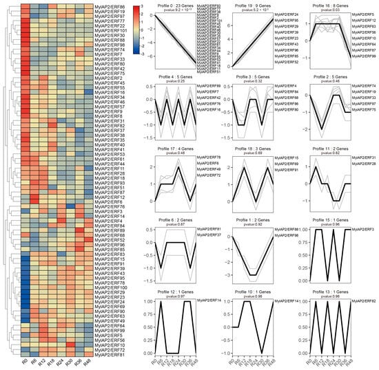 Expression patterns of MylAP2/ERF under water flooding stress. The heatmap to the left shows the expression of MylaAP2/ERF members at different time points under flooding stress. R0–R48 represent the different time points after flooding stress. The right-side figure shows the 15 different expression profiles (profile 0–19) for these MylaAP2/ERF members under flooding stress.