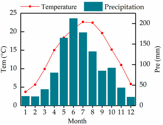 Guiyang is located in the central part of Guizhou Province, China, with an average elevation of around 1100 m. The phenological observation site is situated at Guizhou University (26°25′44″ N and 106°40′09″ E). This site has a subtropical humid and mild climate. During the phenological observation period (1980–2019), the annual average temperature was 14.2 °C, with January being the coldest month (average temperature of 3.7 °C) and July being the hottest month (average temperature of 22.6 °C) (Figure 1). The annual total precipitation was 1091.5 mm, with the majority of precipitation (63%) occurring from May to August (Figure 1).