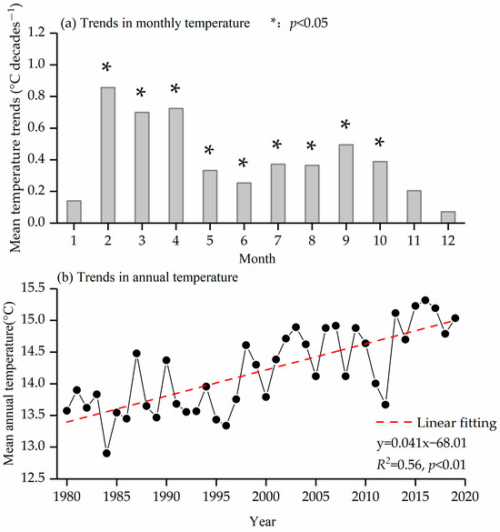 Temperature changes in Guiyang from 1980 to 2019. (a) Linear trends in monthly temperature (the slope of linear regression of monthly temperature against year). *: the linear trend was significant at p < 0.05; (b) Trends in annual temperature.