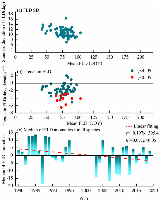 Temporal trends and standard deviation of first leaf date (FLD) for 60 woody plants in Guiyang during the 1980–2019 period. (a) Standard deviation of FLD. (b) Linear trends in FLD (i.e., the slope of linear regression of FLD against year). (c) Time series of median FLD anomalies for all species.