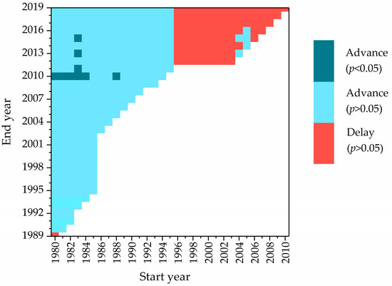 According to the time series of the median FLD anomaly for all the 63 species in Guiyang (Figure 3c), the FLD anomalies were predominantly late before 1995 (average anomaly of 3.73 days), with only one extreme early FLD in 1987 (anomaly of −18.45 days). From 2003 to 2019, the anomalies shifted towards earlier, with 9 out of 17 years showing negative anomalies and the average anomaly being −2.47 days (Figure 3c). Such change from late to early FLD resulted in an overall advance of 1.97 days decades−1 over the 1980–2019 period, although this trend was not statistically significant. Figure 4 shows the changes in median FLD anomalies for different periods. The vast majority of periods longer than 10 years showed an earlier trend. Only in the periods starting between 1980–1983 and ending between 2009–2015, FLD showed a significant advance (p < 0.05). In the period from 1996–2010 to 2011–2019, the trend even showed a non-significant delaying trend. Considering the lack of observation data between 1996–2002, the slight delay in FLD mainly occurred after 2003.