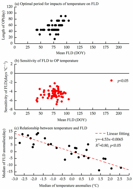 To study the sensitivity of FLD to temperature response, we first determined the optimal period during which temperature influences FLD most significantly. Previous studies have shown that FLD was typically significantly correlated with temperature from a specific preceding period [21,35,36]. Using the multi-year average FLD as the endpoint (EP), Pearson’s correlation coefficient between temperature and FLD was calculated for each period [EP – 15 × i, EP] (i = 1, 2, …, 12), with a step of 15 days. The period with the highest absolute value of the correlation coefficient was selected as the optimal period (OP) influencing FLD. Subsequently, regression analysis was performed on the FLD of each plant species and the mean temperature of the optimal period:
