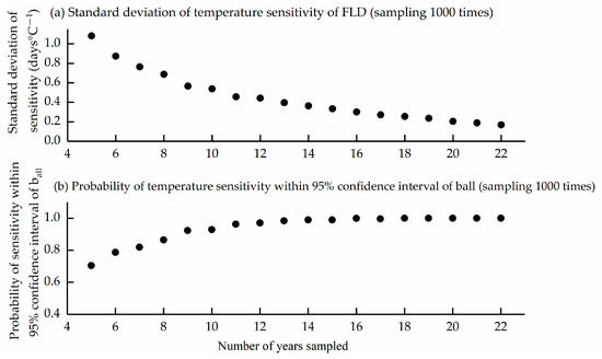 The impact of sample size on estimates of temperature sensitivity of first leaf date (FLD). (a) Standard deviation of temperature sensitivity; (b) Probability of temperature sensitivity falling within the 95% confidence interval of ball. ball is the estimated temperature sensitivity based on data from all observed years.