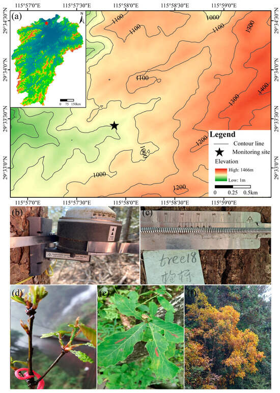 (a) The location of the study site at Lushan Mountain in Southeastern China (The location of Lushan Mt. in Jiangxi Province is indicated by a red pentagram in the inset). (b,c) Instrumented trees with band dendrometers. (d,e) Pictures of key phenological stages of primary growth in Quercus serrata, in which sampled leaf/branch is marked with a rope or red marker. (d) Leaf unfolding (15 April 2017); (e) new shoot growth (24 March 2017); (f) leaf senescence (4 November 2017).
