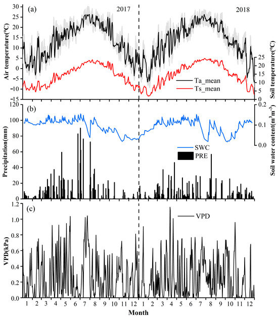 Annual courses of (a) mean daily air temperature (Ta_mean; maximum and minimum air temperatures are depicted in gray shadings) and daily mean soil temperature (Ts_mean), (b) daily total precipitation (Pr) and mean daily soil water content (SWC) and (c) mean daily vapor pressure deficit (VPD) at the study site in Lushan Mountain during 2017 and 2018.