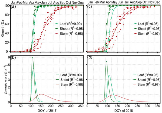 Seasonal growth dynamics (a,c) and daily growth rates (b,d) of leaves, shoots and stems of Quercus serrata during 2017 and 2018. Closed points represent measured data, and fitting curves are modeled by applying Gompertz function (see Table 3 for parameters).