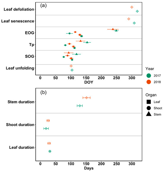 Comparisons of critical timings of phenological phases (a) and growth durations (b; diamond symbols) for primary and secondary growth of Quercus serrata in 2017 and 2018. Leaf unfolding, senescence and defoliation (diamond symbols in the upper panel) are defined based on observational photos. SOG, start of growth; Tp, timing of peak growth; EOG, end of growth.