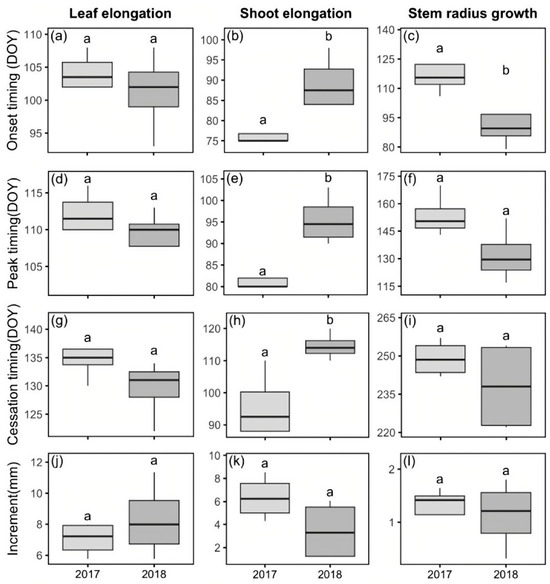 Timings of (a–i) key phenological phases and (j–l) annual increments (mean ± SD) of leaves, shoots and stems of Quercus serrata during the growing seasons of 2017 and 2018. Different lowercase letters indicate significant differences in phenological phases and annual increments between years (p < 0.05).
