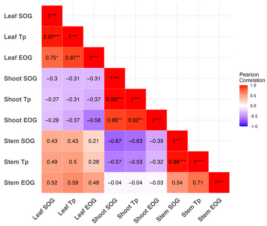 For each organ, a strong positive association was generally found between the onset, peaking and cessation timings for the leaf (r = 0.75–0.97, p < 0.1), shoot (r = 0.88–0.99, p < 0.05) and stem (r = 0.54–0.98) growth phenology (Figure 6). However, there were no consistent temporal correlations of critical phenological phases among different organs. The shoots’ SOG, Tp and EOG negatively affected the phenological events in leaves and stems. In contrast, a weak positive correlation was observed between the phenological events in leaves and stems (Figure 6), indicating that an earlier start in phenological phases in leaves can lead to earlier subsequent phenological phases in stems.