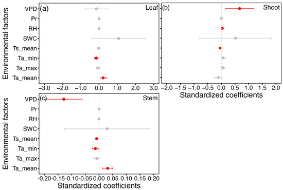 Results of linear mixed analysis of effects of weekly environmental factors prior to the investigated date on weekly increments of leaves (a), shoots (b) and stems (c) for Quercus serrata during 2017 and 2018. Significant levels (p < 0.05) are depicted in red, while gray indicates nonsignificant levels.
