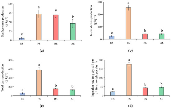 ES: soil + E. fetida; PS: soil + P. corethrurus; RS: soil + A. robustus; AS: soil + A. aspergillum. (a) Surface casts production; (b) internal casts production; (c) total casts production; (d) ingestion rate. n = 5. Cast production and ingestion rate for different earthworms. Different lowercase letters indicate that there were significant differences in the cast production and ingestion rates of four earthworms (n = 5, p < 0.05).