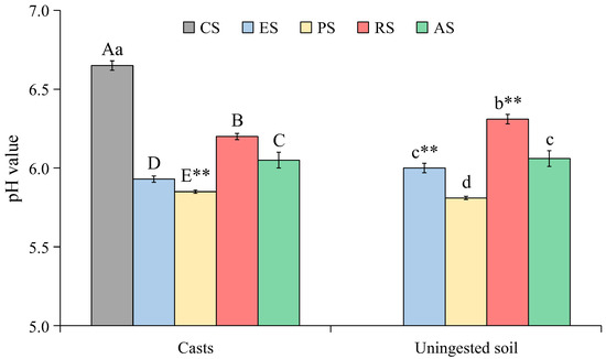 Soil pH values in soils affected by different earthworms. Different capital letters indicated that there were significant differences in the cast group. Different lowercase letters indicated that there were significant differences in the uningested soil group (n = 5, p < 0.05). (**) p < 0.01 relate to the significant differences between casts and the uningested soil group of the T test, respectively.