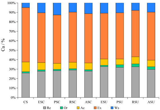 The percentage of five speciations of Ca in casts and the uningested soil of four earthworm species (n = 5). CS: control soil; ESC: cast of EF; PSC: cast of PC; RSC: cast of AR; ASC: cast of AA; ESU: uningested soil of EF; PSU: uningested soil of PC; RSU: uningested soil of AR; ASU: uningested soil of AA.