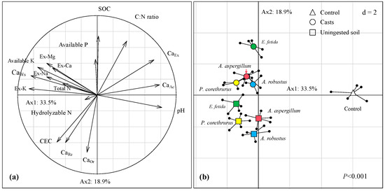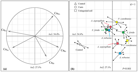 Projection of soil Ca speciations, exchangeable K, Na, Ca, Mg contents, etc., in casts and uningested soils by PCA analysis. (a) Projection of variables; (b) sore plots in soils. n = 5.