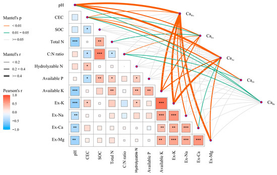 Correlation analysis between soil Ca speciations and exchangeable K, Na, Ca, Mg contents, etc., in casts and uningested soil. n = 5. (***) p < 0.001, (**) p < 0.01, (*) p < 0.05 relate to the significant differences between corresponding soil indicators in a T test, respectively.