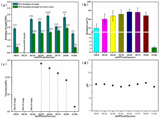Bonding performances of SPI–sucrose adhesives. (a) Bonding strength; (b) insoluble contents; (c) viscosity; and (d) pH of cured adhesives. Note: The data in parentheses indicate the wood failure rate.