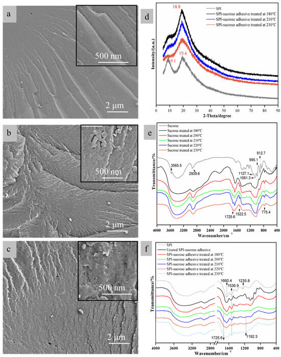 (a–c) SEM images of the powder of SPI–sucrose adhesives cured at 180, 210 and 230 °C; (d) XRD curves of SPI–sucrose adhesives; (e) FTIR curves of sucrose treated at different temperatures; (f) FTIR curves SPI–sucrose adhesives cured at different temperatures.