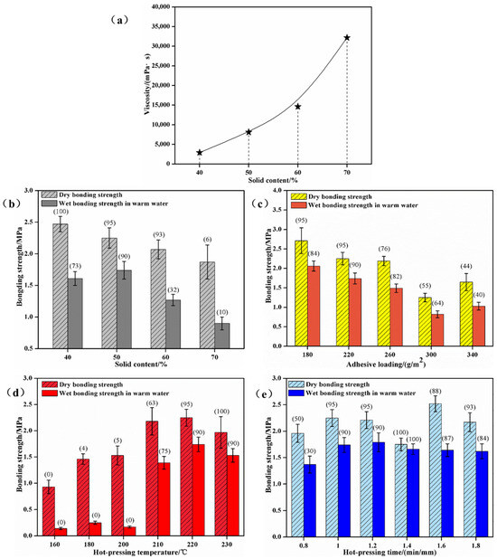 Effects of preparation parameters on bonding performances. (a) The relationship between the viscosity and solid content of the adhesive; (b) the relationship between the bonding strength and solid content of the adhesive; (c) the relationship between the bonding strength and adhesive loading; the effects of hot-pressing temperature (d) and hot-pressing time (e) on the bonding strength. Note: The data in parentheses represent the wood failure rate.