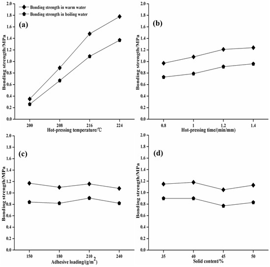 As seen from Table 2 and Table 3 and Figure 4, the influence of each factor in the orthogonal experiment on the bonding performance is as follows: pressing temperature > pressing time > solid content > adhesive loading. The influence of hot-pressing temperature is the most significant, followed by hot-pressing time, solid content, and adhesive loading, which has no significant influence. The suitable preparing parameters for plywood are a pressing temperature of 216 °C, a pressing time of 5 min, a solid content of 50%, and adhesive loading of 220 g/m2. Under this condition, the plywood has a bonding strength in warm water of 1.74 MPa, a bonding strength in boiling water of 1.50 MPa, and a wood failure rate of more than 80%.