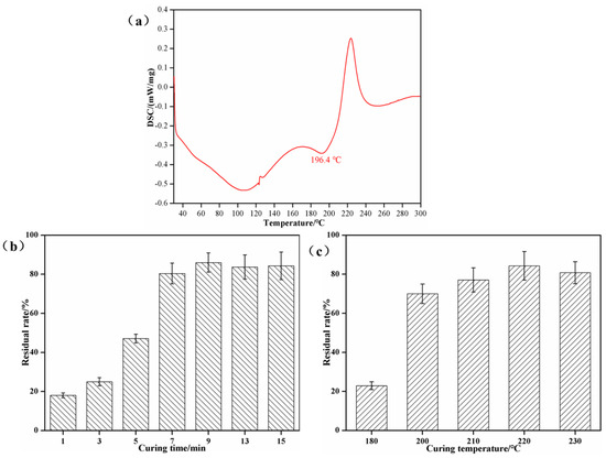 Curing performance of SPI–sucrose adhesives. (a) DSC curve of SPI–sucrose adhesives; (b) effects of curing temperature on the insoluble contents of cured adhesives; (c) effects of curing time on the insoluble contents of cured adhesives.