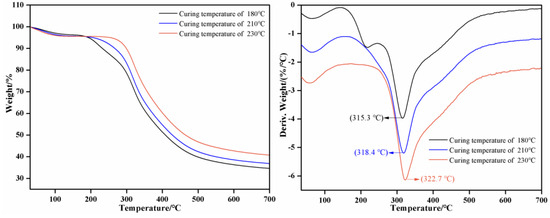 The results of TG-DTG of SPI–sucrose adhesives are shown in Figure 6. The mass loss of the adhesive is less than 10% at 30~200 °C, which is due to the evaporation of moisture from the adhesive. Starting from 200 °C, the adhesive experiences great weight loss. When the curing temperature is 180 °C, 210 °C, and 230 °C, the temperature at which the maximum weight loss of the cured product of the adhesive occurs is 315.3 °C, 318.4 °C, and 322.7 °C, respectively, showing that increasing the curing temperature improves the thermal stability of the cured adhesive. When the temperature is 700 °C, the residual weight is 34.6%, 36.9% and 40.7%, respectively. Combined with the analysis results of the curing mechanism, it is further demonstrated that the curing temperature has a crucial influence on the degree of cross-linking and the thermal stability of the cured adhesive.