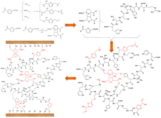 Diagram of soy protein adhesive cross-linked with 5-hydroxymethylfurfural.
