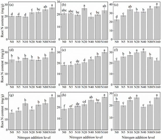 Changes in root N concentration in plants under different N additions (mean ± SE). (a) Agrimonia pilosa, (b) Phlomis maximowiczii, (c) Viola collina, (d) Potentilla fragarioides, (e) Geum aleppicum, (f) Ranunculus japonicus, (g) Sanguisorba officinalis, (h) Bistorta officinalis, (i) Thalictrum aquilegifolium. Different letters indicate significant differences between different N addition treatment within the same herbaceous plants (p < 0.05).