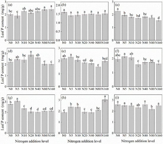 Changes in leaf P concentration in plants under different N additions (mean ± SE). (a) Agrimonia pilosa, (b) Phlomis maximowiczii, (c) Viola collina, (d) Potentilla fragarioides, (e) Geum aleppicum, (f) Ranunculus japonicus, (g) Sanguisorba officinalis, (h) Bistorta officinalis, (i) Thalictrum aquilegifolium. Different letters indicate significant differences between different N addition treatment within the same herbaceous plants (p < 0.05).