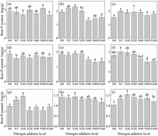 Changes in root P concentration in plants under different N additions (mean ± SE). (a) Agrimonia pilosa, (b) Phlomis maximowiczii, (c) Viola collina, (d) Potentilla fragarioides, (e) Geum aleppicum, (f) Ranunculus japonicus, (g) Sanguisorba officinalis, (h) Bistorta officinalis, (i) Thalictrum aquilegifolium. Different letters indicate significant differences between different N addition treatment within the same herbaceous plants (p < 0.05).
