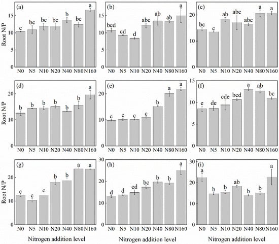 Changes in the N/P ratios in plant roots under different N additions (mean ± SE). (a) Agrimonia pilosa, (b) Phlomis maximowiczii, (c) Viola collina, (d) Potentilla fragarioides, (e) Geum aleppicum, (f) Ranunculus japonicus, (g) Sanguisorba officinalis, (h) Bistorta officinalis, (i) Thalictrum aquilegifolium. Different letters indicate significant differences between different N addition treatment within the same herbaceous plants (p < 0.05).