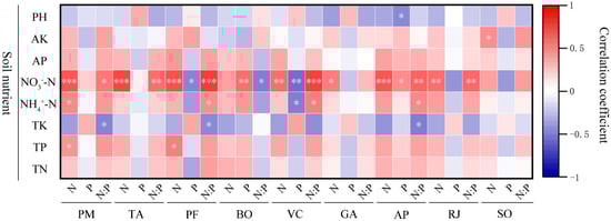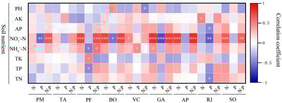Correlation analysis of leaf N and P concentrations and ratios with soil nutrient concentrations of different plants. Soil nutrients include pH, AK (soil available potassium concentration), AP (soil available phosphorus concentration), NO3−-N (soil nitrate nitrogen concentration), NH4+-N (soil ammonium nitrogen), TK (soil total potassium concentration), TP (soil total phosphorus concentration), and TN (soil total nitrogen concentration). The plant species studied include PM (Phlomis maximowiczii), TA (Thalictrum aquilegifolium), PF (Potentilla fragarioides), BO (Bistorta officinalis), VC (Viola collina), GA (Geum aleppicum), AP (Agrimonia pilosa), RJ (Ranunculus japonicus), and SO (Sanguisorba officinalis). *** p < 0.001; ** p < 0.01; * p < 0.05.