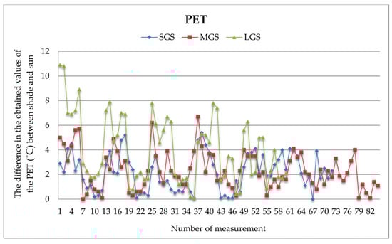 Research on the impact of the area of green spaces on the provision of thermal comfort in urban open spaces has shown that the largest average difference in PET index values between measurement points located on green spaces and those outside them was recorded at LGS (4.04 ± 2.74 °C), followed by a slightly smaller difference at MGS (2.32 ± 1.53 °C), and the smallest at SGS (2.19 ± 1.49 °C) (Table 2). The difference in PET index values at LGS ranged from 0.1 to 10.90 °C, MGS from 0 to 6.70 °C, and SGS from 0 to 5.40 °C.