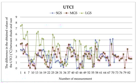 The largest mean difference in UTCI values between measurement points on green spaces and those outside the green space was recorded at LGS (3.27 ± 1.97 °C), followed by a slightly smaller difference at SGS (2.12 ± 1.32 °C), and the smallest at MGS (2.05 ± 1.14 °C). The difference in UTCI values ranged from 0.1 to 7.70 °C at LGS, 0–5.20 °C at SGS, and 0–4.4 °C at MGS. Furthermore, all the studied green spaces showed a difference compared to areas without greenery, with a range of 2.19–4.04 °C for PET and 2.05–3.27 °C for UTCI, with mean values of 2.75 °C for PET and 2.41 °C for UTCI.