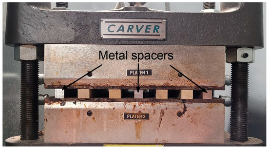 The densification process began with a pre-steaming plastification treatment in an autoclave, using saturated steam at a temperature range of 120–130 °C. Immediately after the steaming, the specimens were placed in a hydraulic hot press. A Carver 38952NE1 hydraulic press was used, with both press plates heated to the specified temperature. As shown in Figure 1, the target thickness of the samples was ensured by placing three metal spacers between the press plates, preventing physical over-compression of the specimens.