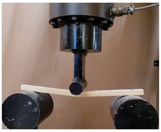 The bending test was conducted following the ASTM D143-14 standard (Section 8) [15]. The test is represented in Figure 3, using center-point loading at a test rate of 1.3 mm/min. The span value was 254 mm for the densified specimens and 266 mm for the control specimens, ensuring the required minimum span-to-depth ratio of 14. Tests were performed in the densified direction (tangential direction). The failure type was recorded for each specimen, and the modulus of rupture (MOR) in (MPa) was calculated using Equation (6):