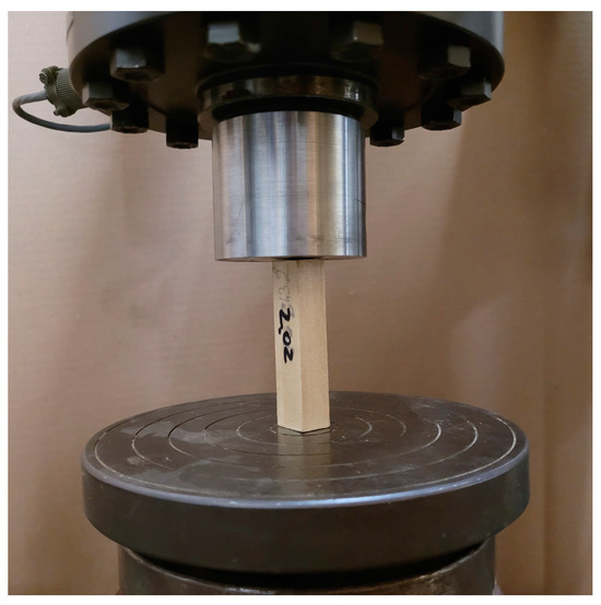 Compression parallel to grain was performed according to ASTM D143-14 standard (Section 9). Figure 4 illustrates the setup of the compression tests. The test specimens had a length of 76 mm, and the load was applied at a rate of 0.003 mm/mm of nominal specimen length per minute. For each specimen, the maximum load was recorded. The compressive strength (σc) in (MPa) was calculated using Equation (7):