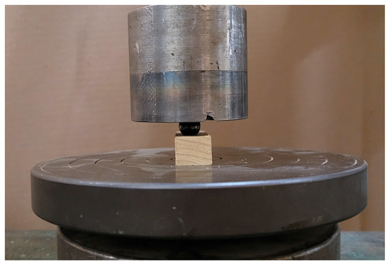 Hardness was determined following ASTM D143 (Section 13) [15]. This is the standard test method for small clear specimens of timber, using a modified ball test with a ball diameter of 11.3 mm, as shown in Figure 5. The projected area of the ball on the test specimen was 1 cm2. Penetrations were performed on the densified (tangential) surface of each specimen. The testing speed was 6 mm per minute, and the load at which the ball penetrated to half its diameter was recorded.