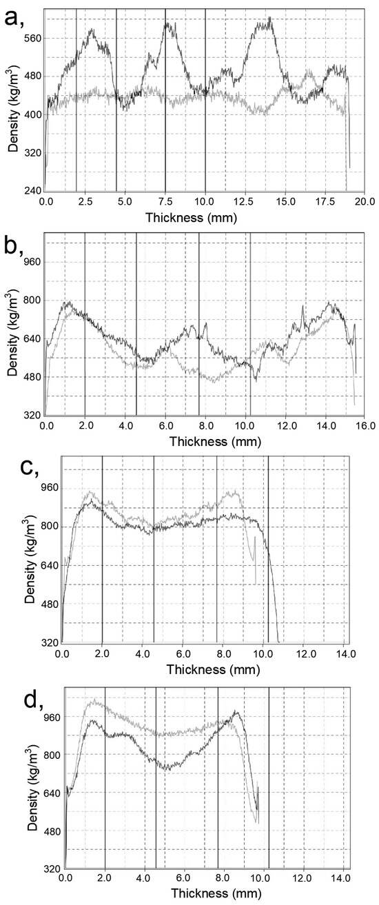 As explained in Section 2, the samples in the density profile analysis were grouped by compression ratio, while the effects of the other three factors (pre-steaming, press temperature, and pressing time) on the density profile were reflected in the deviations of the results. Figure 6 shows the density profile of (a) two control specimens; (b) two samples from setup #1; (c) two samples from setup #7; and (d) two samples from setup #16.