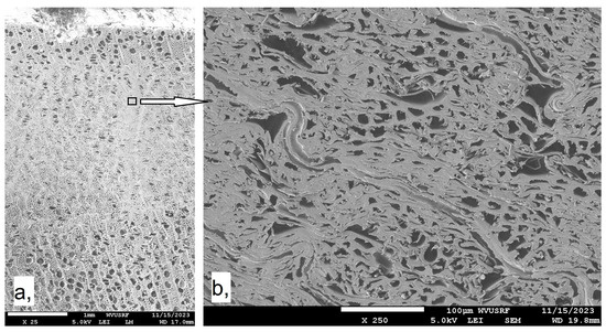 In Figure 7a, it can be observed that beyond the densified zone, the cell morphology did not change, suggesting that the density differences between earlywood and latewood caused these fluctuations. In addition, close to the specimens’ surface, a non-densified zone can be observed, which also appears on the density profile. Figure 7b captures the densified zone, where the extent of deformation and the bending of cell walls indicate that the wood exhibited viscoelastic behavior during compression. However, the presence of open cells suggests that the 20% compression ratio did not fully close the cell structure.