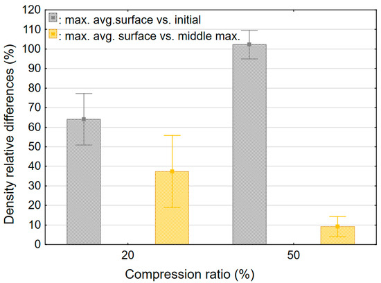 For the 20% compression ratio, the relative difference between the middle section and surface densities is 37.3%, which is significantly larger compared to the 50% compression ratio, where this difference is only 9.1%. This indicates a more uniform density distribution in the cross-section for the higher compression ratio studied. Additionally, the relative difference from the average initial density to the surface density (SDmax.avg) is 64% for a 20% compression ratio, compared to 102.3% for the 50% compression ratio, reflecting the greater surface density achieved at the higher compression ratio.