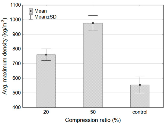Figure 9 shows the average maximum density for samples from both compression ratios and the control group. For the densified samples, the average maximum density represents the average value of the density peak near the surface (SDmax.avg) and was calculated using Equation (3). For the control samples, the maximum density represents the latewood density, which appears as a periodic peak on the density profile (MDmax).