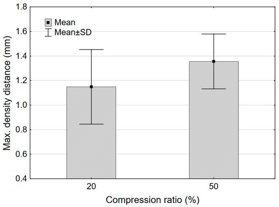 The distance between the average maximum density and the specimens’ surface (Figure 2), grouped by compression ratio, is presented in Figure 10.