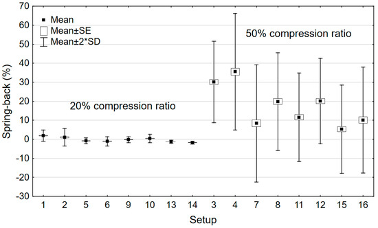 Immediately after the press was opened, the thickness of each sample was measured to evaluate spring-back. Spring-back provides information about the immediate elastic recovery caused by the shape memory effect of the cells. This memory effect can pose a significant issue when densified wood is exposed to water or high-humidity environments. Figure 11 presents the spring-back results across the 16 experimental setups, categorized by the densification ratio.