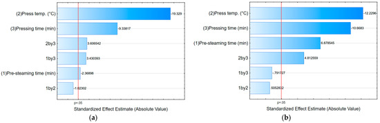 The steaming time also significantly affected the compressive strength values, whereas the pressing time did not significantly affect the compressive strength values. Based on the Pareto analyses, the high level of setup parameters for both the compression ratio (50%) and the press temperature (150 °C) was beneficial; however, the longer pre-steaming time (60 min) was detrimental to the strength performance. The strongest interaction can be observed between the compression ratio and the pressing temperature.