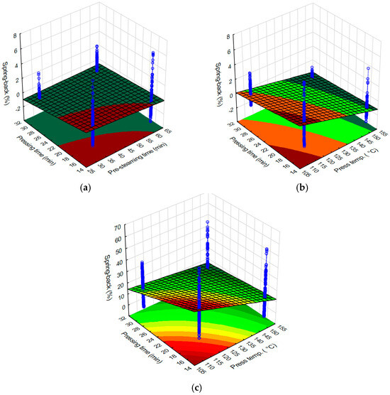 Response surface plots of the spring-back related to specific variables. (a) Interaction between pressing time and pre-steaming time at a 20% compression ratio; (b) interaction between pressing time and press temperature at a 20% compression ratio; (c) interaction between pressing time and press temperature at a 50% compression ratio.