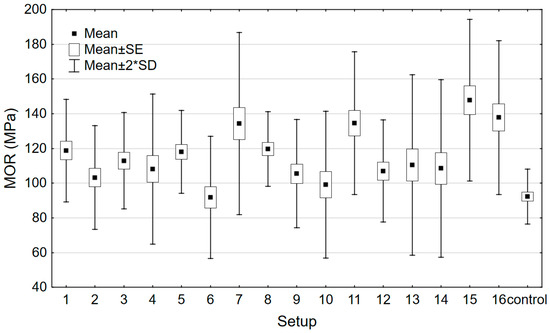 Figure 14 presents the bending strength results of the 16 experimental setups and the control samples, measured according to the ASTM D143 [15] standard procedures.