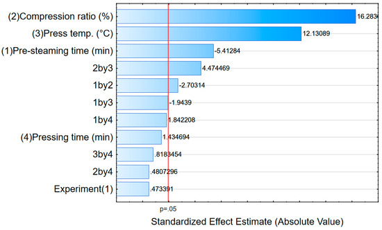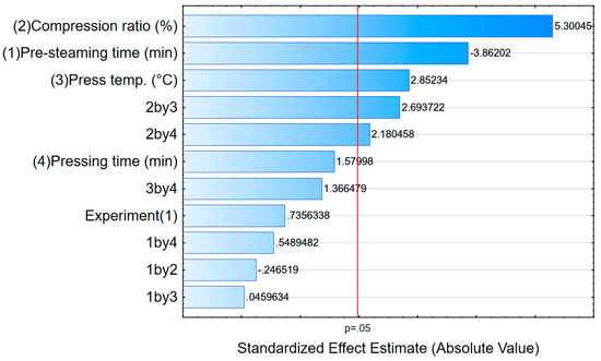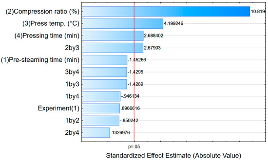 The key role of the compression ratio and press temperature was confirmed via ANOVA and Pareto analyses. Figure 18 shows the Pareto chart with the Standard Effect Estimate (SEE) values for the four main effects and the two-level interactions.