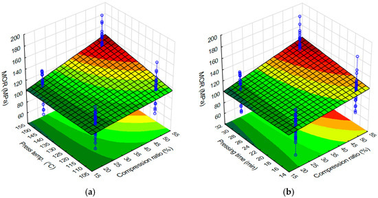 Response surface plots of the bending strength as response variable. (a) MOR in function of press temperature and compression ratio; (b) MOR in function of pressing time and compression ratio.